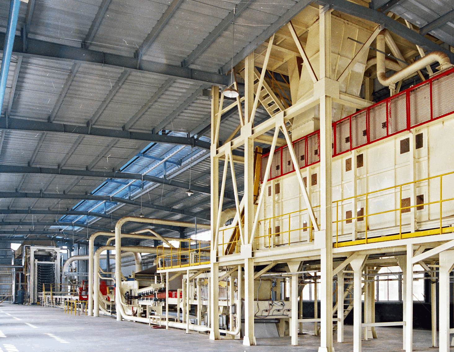 日產130—350立方米中(高)密度纖維板成套設備是以木質或其他植物纖維為原料,施加脲醛樹脂或其他適用的膠黏劑,通過熱壓壓制成密度在650—880kg/m3的人造板,是綜合性能優良的一種板材。它具有緊密而光滑的表面,結構均勻的芯層,板材的表面和邊部具有良好的機械加工、成型加工的性能,是天然板材的理想替代品。 整條生產線包括:木片備料、纖維制備、調供膠、鋪裝、熱壓、后處理、砂光等工段。